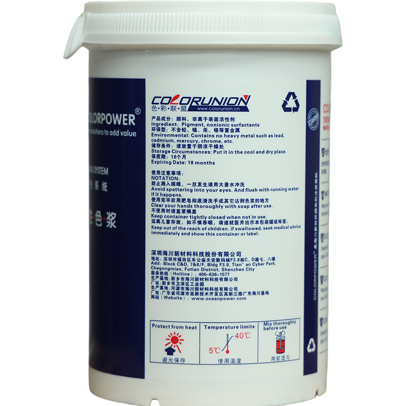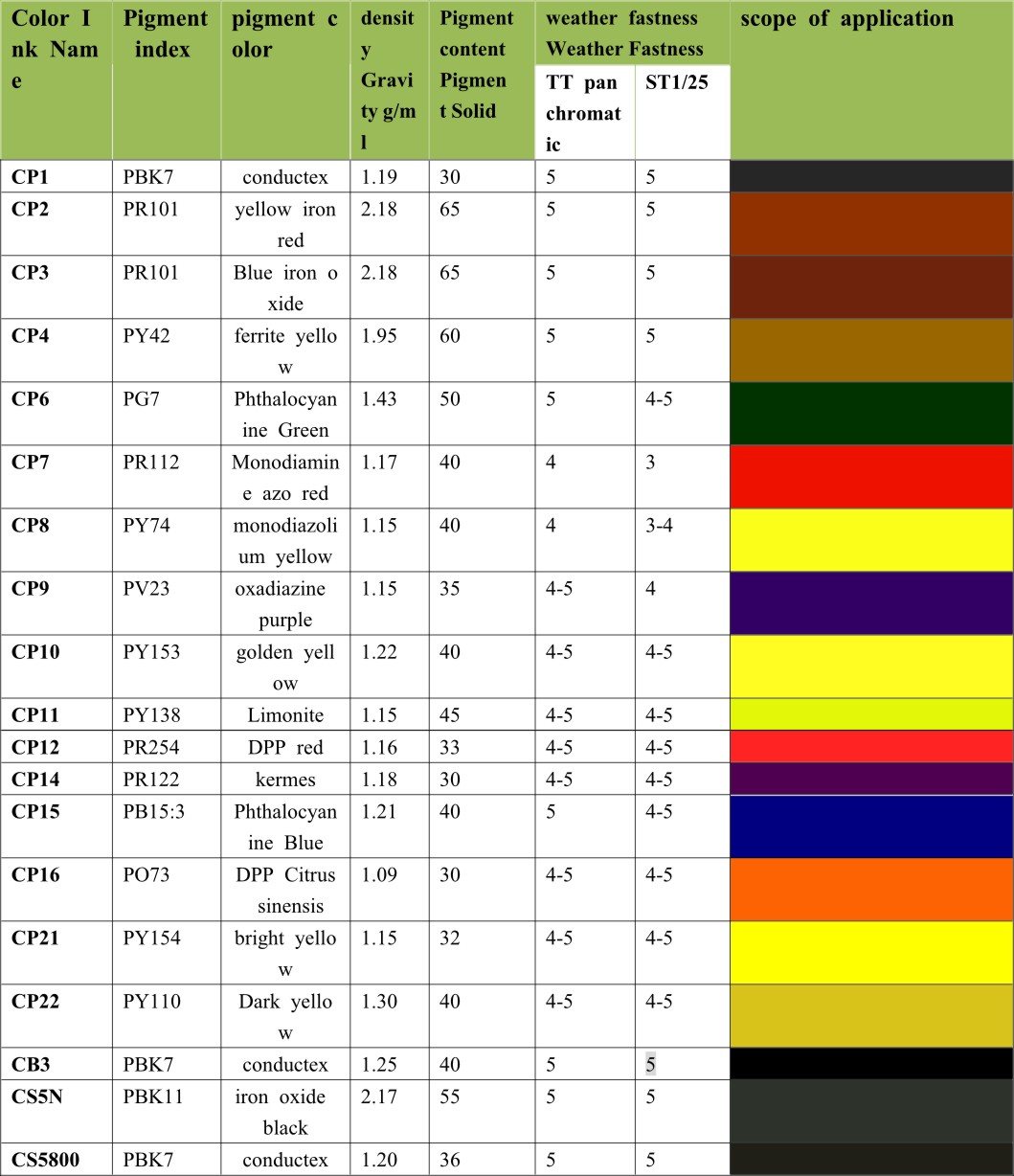 Safety: The CP series color pastes do not contain lead chromate or other heavy metals harmful to human health, and no hazardous outcome reports have been reported within the application scope of this product.